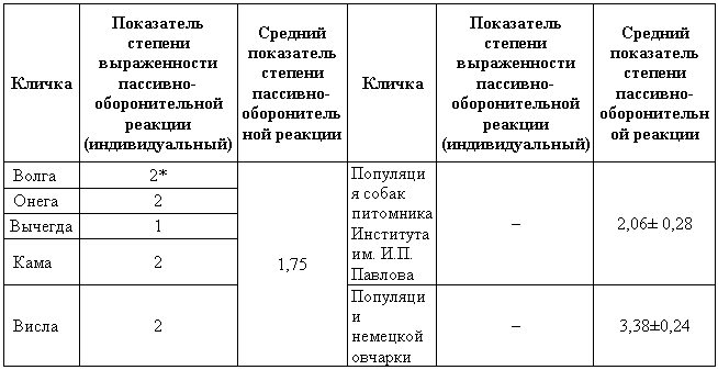 Значение генотипа для проявления пассивно-оборонительной реакции у собак ясно видно и из коэффициента корреляции между степенью выраженности данной реакции у братьев и сестер, воспитанных в одних и тех же условиях частичной изоляции питомника Института эволюционной физиологии и патологии высшей нервной деятельности им И. П. Павлова (r=+0,54±0,06).