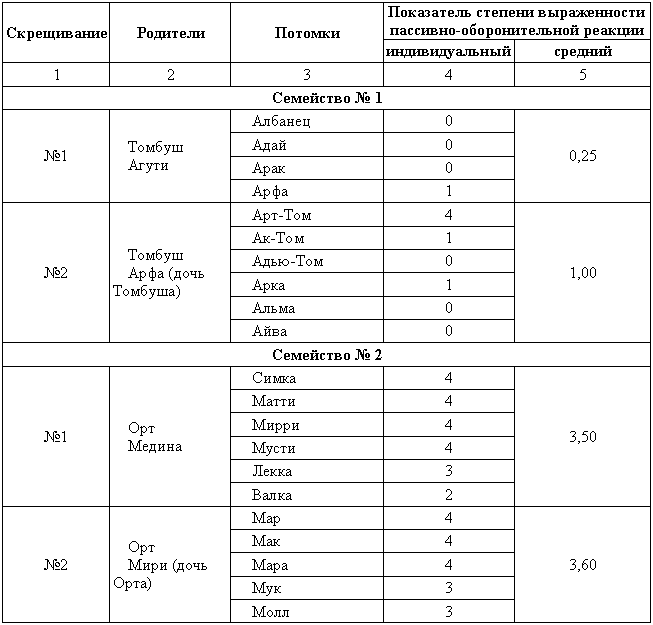 Таблица 4. Степень выраженности пассивно-оборонительной реакции у собак двух семейств, воспитанных в одних и тех же условиях частной изоляции (питомник Института эволюционной физиологиия патологии высшей нервной деятельности им. И. П. Павлова)