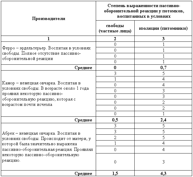 Эти данные свидетельствуют о большой роли генотипа в проявлении и выражении пассивно-оборонительной реакции, возникающей у собак в ответ на изолированные условия воспитания. Данная реакция в своем проявлении и выражении находится в тесной зависимости как от условии воспитания, так и от генотипа собаки.